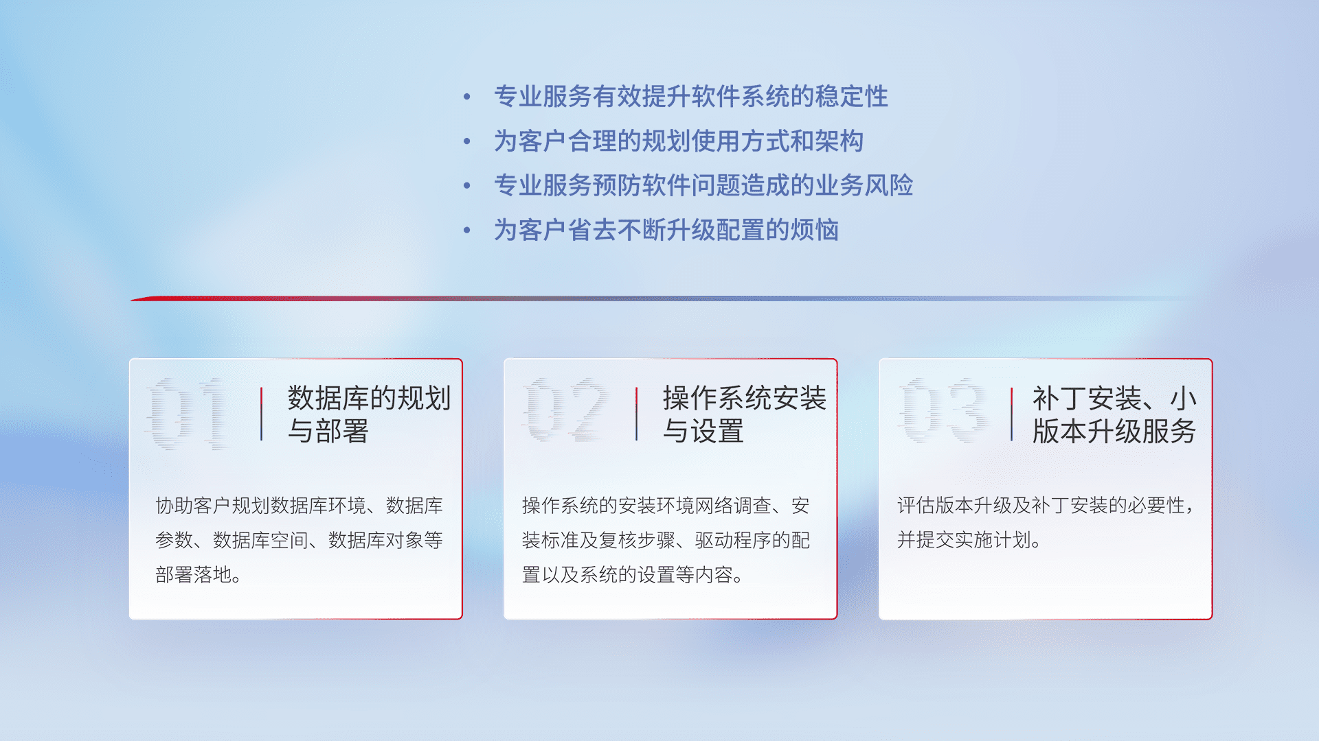 为客户提供软件规模升级、、快速部署、、、按需配置的专业服务,,,,从数据库的规划与部署到操作系统的安装与设置,,,再到补丁安装和小版本升级提供支持。。。