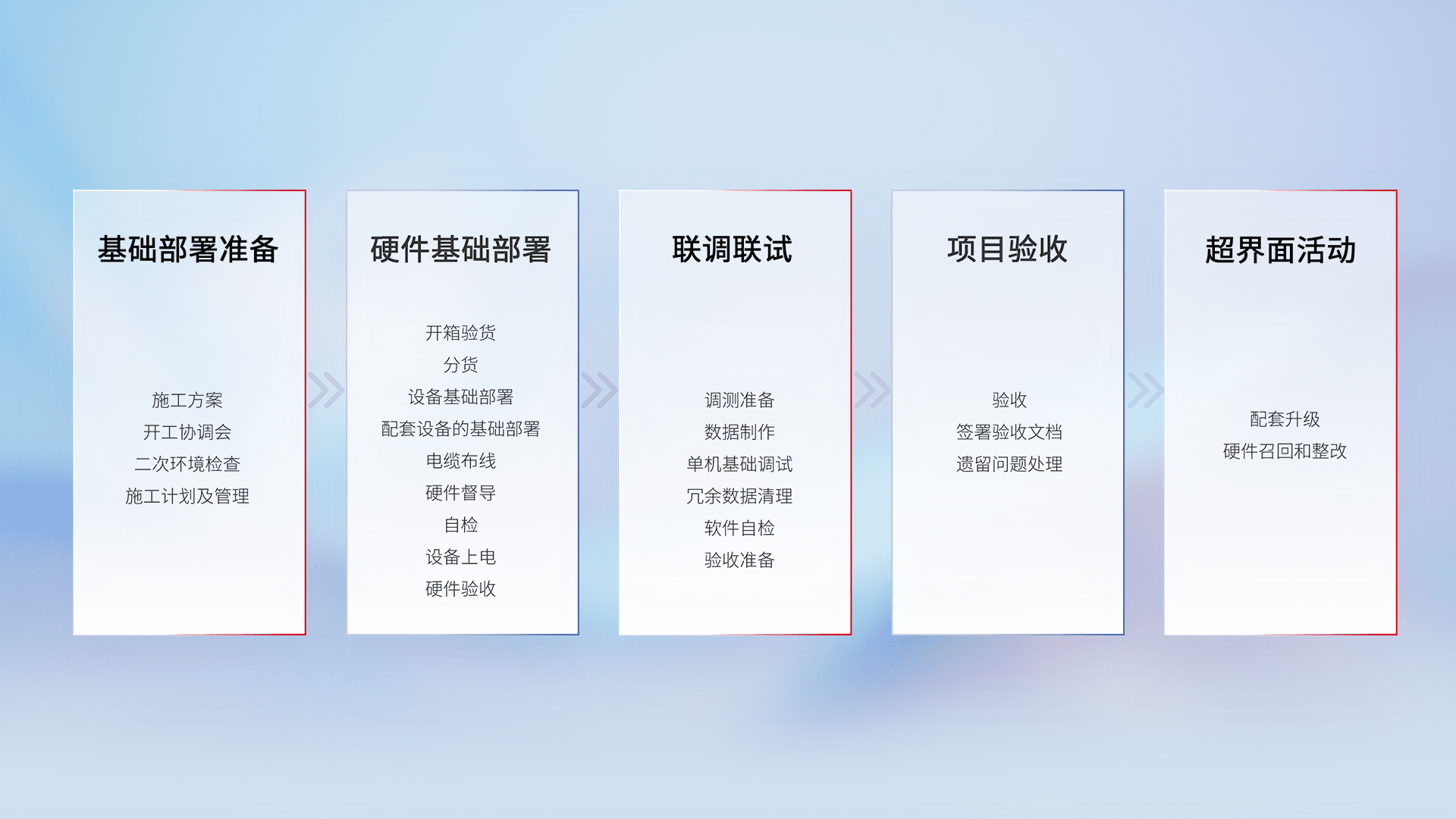 从基础部署准备、、、、硬件基础部署、、联调联试、、、项目验收、、、、越界面活动的全过程可追溯,,保证施工质量和进度。。。