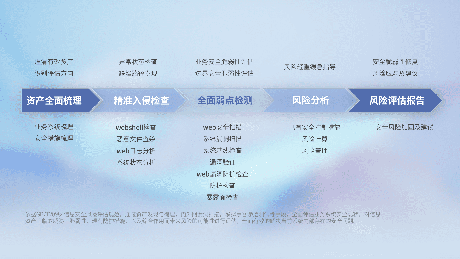 针对客户行业特性,,以专业的安全服务+多厂商联合解决方案提供专属的一站式安全管理服务,,,帮助客户全面感知网络空间威胁,,,基于识别、、、、检测、、、、分析、、、防护、、监测、、响应的服务理论模型,,,,从方案咨询、、集成交付、、评估验证、、优化加固、、、运维运营,,致力于为客户提供完整的闭环管理式安全服务。。。以实战经验为客户打造高抵御风险的安全体系,,,帮助客户发现威胁、、、对抗威胁、、处置威胁,,,,不断积累安全对抗能力,,,,持续保障数字化安全。。。。