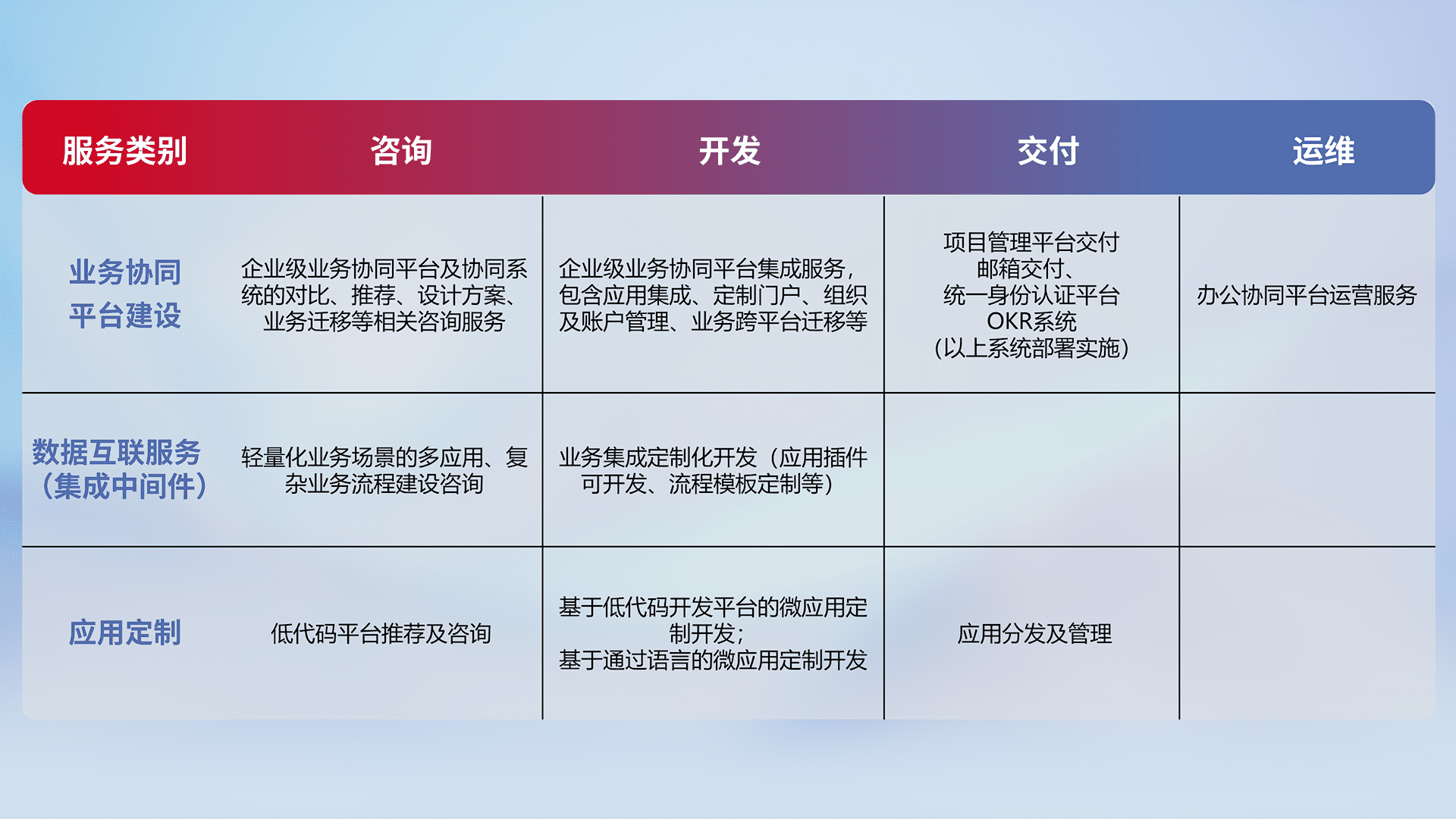 针对钉钉、、、、企微、、IDaas等平台级产品提供产品的规划、、、、方案、、、交付、、、、定制化开发等服务,,实现如统一协同办公、、、、智能客户服务、、、、混合会议管理、、智能数据查询、、、、等业务场景,,实现数字化转型。。。。